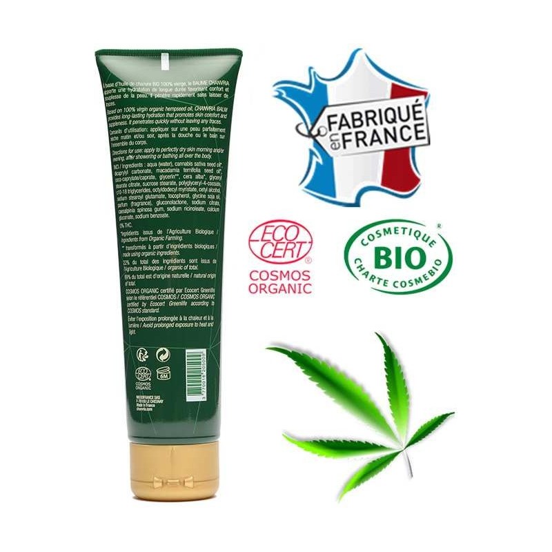 Le baume corps CHANVRIA représente l'excellence des soins naturels certifiés ECOCERT pour une hydratation optimale de votre peau. Cette formule exceptionnelle contient 99% d'ingrédients d'origine naturelle et 23% d'ingrédients biologiques, garantissant un soin respectueux de votre épiderme. L'huile de chanvre bio vierge de l'Aube en Champagne apporte ses 85% d'Oméga 3 et Oméga 6 essentiels pour nourrir, apaiser et restructurer votre peau tout en la protégeant efficacement.