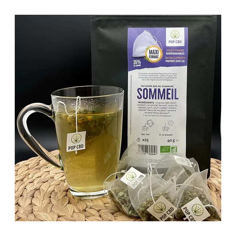 Découvrez la tisane CBD bio sommeil Pop CBD, un mélange exclusif de 12 plantes biologiques pour favoriser la détente et le bien-être nocturne. Composée de 35% de chanvre premium associé à la mélisse, camomille, fenouil et 8 autres plantes soigneusement sélectionnées, cette infusion naturelle vous accompagne vers un repos mérité. Conditionnée en 25 sachets pyramides biodégradables de 40g, fabriquée au Luxembourg selon les standards biologiques les plus exigeants pour une expérience apaisante.