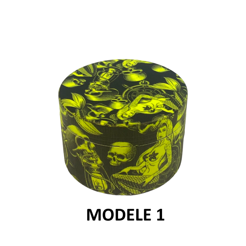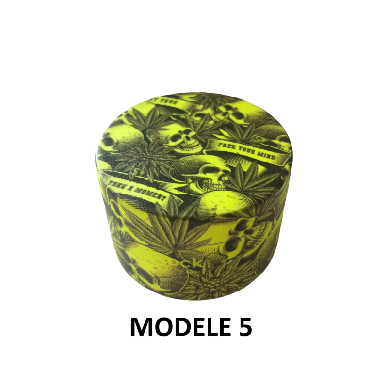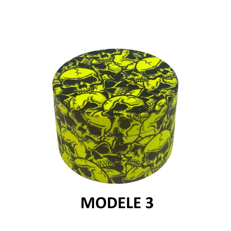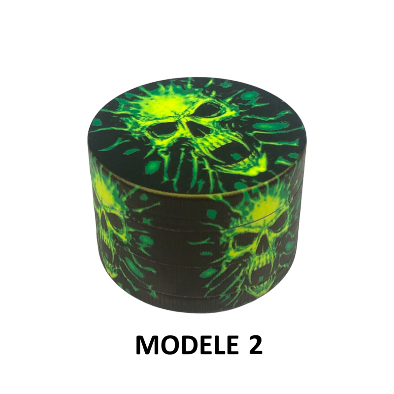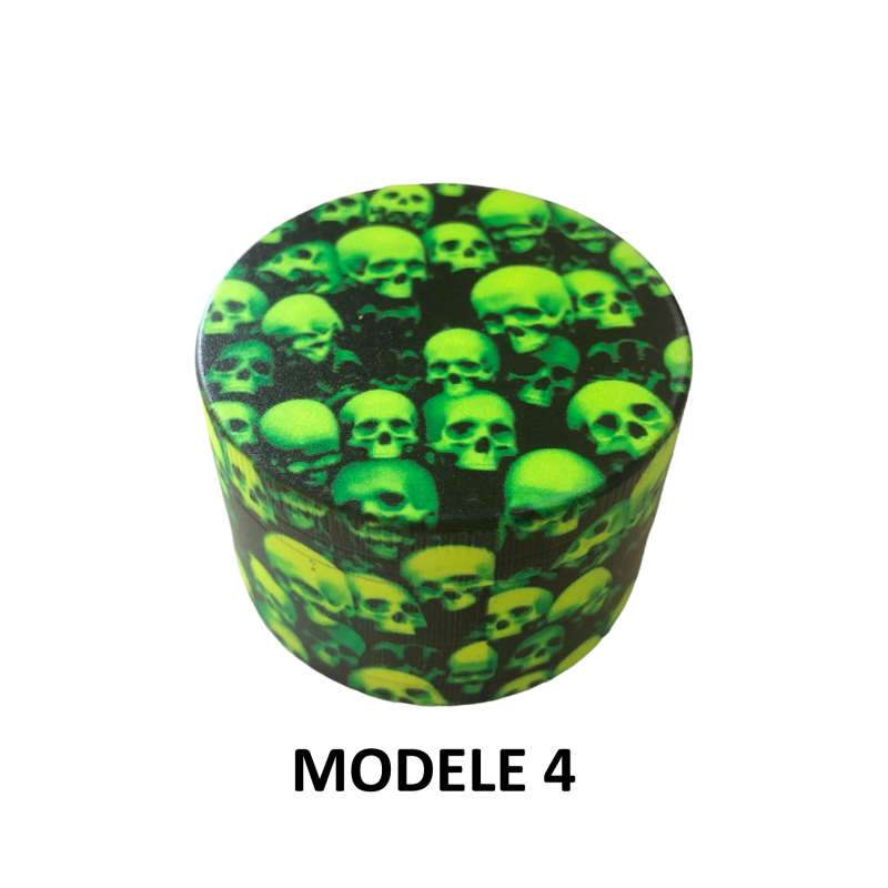 Le Grinder Green Skulls FARO se distingue par son design audacieux aux motifs têtes de mort dans des tons vert et jaune saisissants. Ce broyeur de 50mm de diamètre offre une ergonomie parfaite pour un broyage efficace de vos herbes sèches. Sa conception 4 parties garantit une séparation optimale avec dents supérieures robustes, dents inférieures précises, tamis fin intégré et récupérateur de pollen pratique. La raclette incluse facilite la récupération du pollen le plus fin. Avec 11 modèles disponibles, chaque utilisateur peut choisir le design qui correspond à ses goûts, du Modèle 1 au Modèle 11, offrant des variations esthétiques sur le thème des têtes de mort vertes.