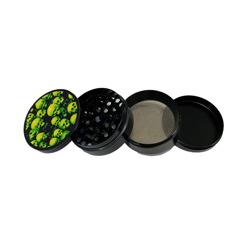 Le Grinder Green Skulls FARO de 50mm arbore un design original avec motif têtes de mort en coloris vert et jaune. Ce broyeur 4 parties comprend dents supérieures et inférieures, tamis intégré, récupérateur de pollen avec raclette incluse. Construction robuste pour un broyage optimal de vos herbes sèches. Disponible en 11 modèles différents selon vos préférences esthétiques. Diamètre parfait pour une prise en main confortable et un usage quotidien efficace.