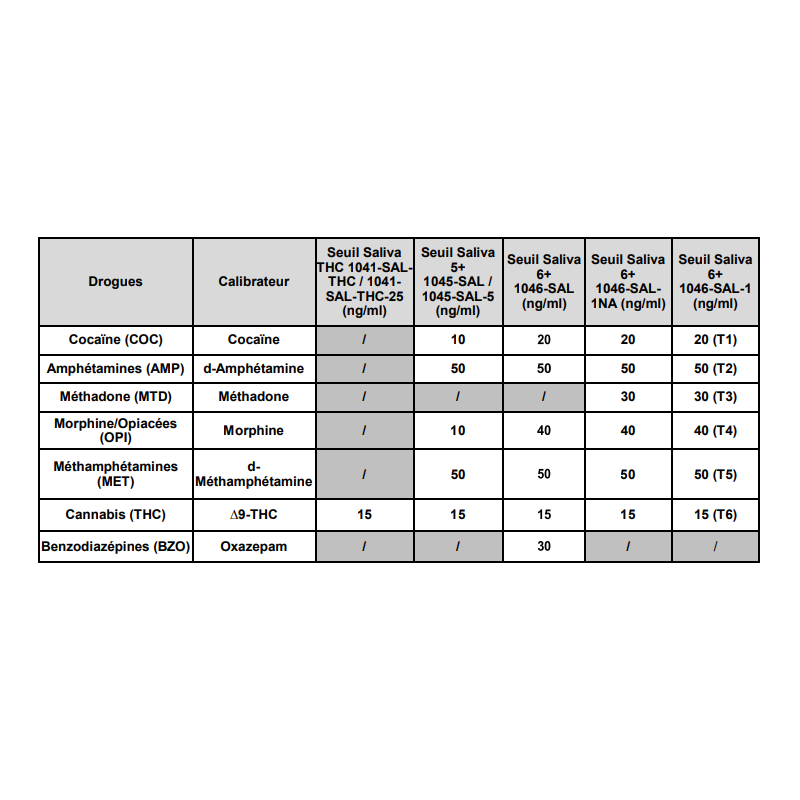 Ce test détecte simultanément 5 types de drogues : héroïne et autres opiacés (OPI10), cocaïne (COC10), amphétamines (AMP50), méthamphétamine/MDMA (MET50), et tétrahydrocannabinol (THC15).