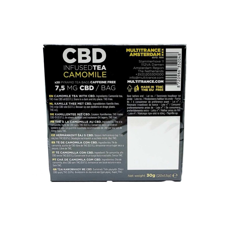Le Thé Camomille CBD Multitrance représente l'excellence dans l'art de l'infusion bien-être. Cette création unique combine harmonieusement les vertus apaisantes traditionnelles de la camomille avec les propriétés relaxantes modernes du CBD. Chaque boîte contient 20 sachets pyramide méticuleusement conçus, offrant 7,5 mg de CBD pur par infusion. Cette formulation équilibrée garantit une expérience gustative délicate tout en procurant les bienfaits recherchés du cannabidiol. L'infusion révèle des notes florales douces et réconfortantes, créant un moment de pure détente idéal pour conclure une journée intense ou simplement pour s'accorder une pause bien-être. La qualité premium de cette infusion CBD sans THC en fait un choix sûr et légal pour tous les amateurs de produits naturels souhaitant intégrer le CBD dans leur routine quotidienne.