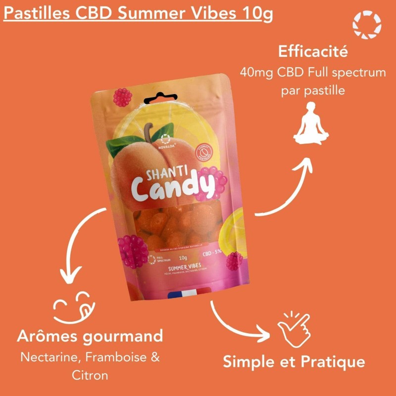 Découvrez une expérience gustative estivale unique avec les bonbons CBD Summer Vibes de NOVALOA. Ces pastilles sans sucre concentrées à 6% de CBD offrent un délicieux mélange de saveurs pêche, framboise, nectarine et citron vert. Fabriquées en France avec du CBD d'origine naturelle, chaque bonbon contient 40mg de cannabidiol pour une détente savoureuse et naturelle au quotidien.